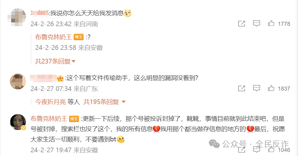博主發(fā)帖后,在回復(fù)網(wǎng)友時告知事情進展,她去報案后,警方?jīng)]受理,隨后她向微信平臺投訴,那個號被封了。“但是號被封掉,搜索欄也沒了,我的所有信息也沒有了”,她說。