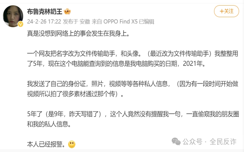 從其表述中得知:2021年開始,就用手機給微信里的“文件傳輸助手”傳資料,包括身份證信息和各種賬號密碼、自己所拍攝的素材等。直到最近,因為發(fā)現(xiàn)朋友圈有個人名字很奇怪:傳瑜文件助手,去看對方朋友圈,從口吻上推斷是個男孩。就去找對方問,打微信電話也不接,發(fā)消息讓對方停止也不回復(fù),所以去報案。