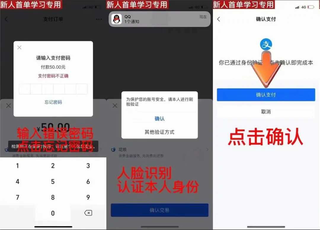 對(duì)方讓小張用支付寶購(gòu)買指定的商品,在付款時(shí),先輸入錯(cuò)誤密碼,然后進(jìn)入刷臉驗(yàn)證環(huán)節(jié),認(rèn)證本人身份后,在跳轉(zhuǎn)的頁(yè)面中點(diǎn)擊確認(rèn)支付。